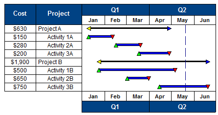 Place the date headings at the top of the schedule, on the bottom of the schedule, within a task row in the schedule, or all of the above. By default, Milestones Simplicity places the date headings at the top of the schedule.