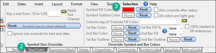Answer 2:On the Dates tab, check to see if the Symbols: Fill to Status Date selection is checked. If so, all symbols after the status date will be either hollow or filled with the color specified for that symbol type in the toolbox. |