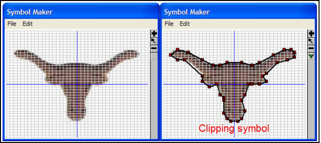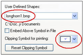 Clipping symbol exampleAs shown below, longhorn1.bmp is the original bitmap symbol whose surrounding background was printing as a white rectangle. To remove this white background, the bitmap's image was used as a symbol overlay in the Symbol Maker. After clipping around it and naming the new symbol, that new symbol was added to the Toolbox and selected as the Clipping Symbol for printing. Thus, the longhorn1.bmp symbol will print without the white background because the clipping symbol prevents it.