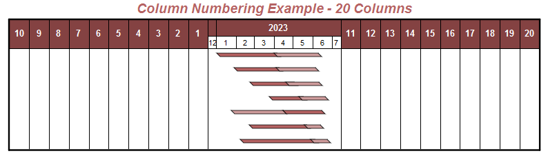 Here is how columns are numbered in Milestones Professional 2002 and later versions. Use20Columns must be called to be able to use all of these 20 columns.