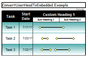 Example: Convert the two user defined date headings on this schedule to be embedded (instead of saved in an external file.) Public Sub ChangeMyHeadingToEmbedded() Set objMilestones = GetObject("c:\schedules\customheading.MLP", "Milestones") With objMilestones End With Exit Sub End Sub