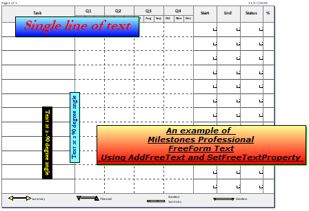 Dim textstring As String, textstring2 As String, textstring3 As String, textstring4 As String Dim freetextindex As Integer With milestonesobject textstring = "An example of " + Chr(13) + "Milestones Professional" + Chr(13) + "FreeForm Text" + Chr(13) + " Using AddFreeText and SetFreeTextProperty " ' Chr(13) is a line break, forces text onto a new row ' string, x position in inches from left, y position in inches from top freetextindex = .AddFreeText(textstring, 2, 2) .setfreetextproperty(freetextindex, "Page", 1) ' Only on page 1 .setfreetextproperty(freetextindex, "Xpos", 4) ' change position to 4 inches in from the left edge .setfreetextproperty(freetextindex, "Ypos", 5) ' change position to 5 inches down from the top .setfreetextproperty(freetextindex, "TextColor", RGB(0, 0, 0)) ' set color to black .setfreetextproperty(freetextindex, "Border", 1) ' turn on the border .setfreetextproperty(freetextindex, "Transparent", 0) ' not transparent, so background color will appear .setfreetextproperty(freetextindex, "BackgroundColor", RGB(255, 0, 0)) ' Set background color .setfreetextproperty(freetextindex, "BackgroundColorTarget", (RGB(255, 255, 153))) 'Set a second color for special effects .setfreetextproperty(freetextindex, "FadeType", 2) ' Use the Fade to top special effect .setfreetextproperty(freetextindex, "Italic", 1) ' Turn on Italic .setfreetextproperty(freetextindex, "Shadow", 1) ' Turn on a shadow .setfreetextproperty(freetextindex, "ShadowColor", RGB(0, 255, 0)) ' Set the shadow color to green .setfreetextproperty(freetextindex, "TextHeight", 22) ' Set the text size to 22 point .setfreetextproperty(freetextindex, "Underline", 1) ' Turn on Underline .setfreetextproperty(freetextindex, "Bold", 1) ' Turn on Bold .setfreetextproperty(freetextindex, "TagInfo", "Text1") ' Add a tag .setfreetextproperty(freetextindex, "FontName", "Verdana") ' Set the font .setfreetextproperty(freetextindex, "TextAlign", 1) ' Use Center Alignment textstring2 = " Single line of text " freetextindex = .AddFreeText(textstring2, 2, 2) ' string, x position in inches from left, y position in inches from top .setfreetextproperty(freetextindex, "Page", 1) ' Only on page 1 .setfreetextproperty(freetextindex, "Xpos", 1) ' change position to 1 inches in from the left edge .setfreetextproperty(freetextindex, "Ypos", 1) ' change position to 1 inches down from the top .setfreetextproperty(freetextindex, "TextColor", RGB(255, 0, 0)) ' set color to red .setfreetextproperty(freetextindex, "Border", 1) ' turn on the border .setfreetextproperty(freetextindex, "Transparent", 0) ' not transparent, so background color will appear .setfreetextproperty(freetextindex, "BackgroundColor", RGB(0, 0, 255)) ' Set background color .setfreetextproperty(freetextindex, "BackgroundColorTarget", (RGB(153, 255, 255))) 'Set a second color for special effects .setfreetextproperty(freetextindex, "FadeType", 2) ' Use the Fade to top special effect .setfreetextproperty(freetextindex, "Italic", 1) ' Turn on Italic .setfreetextproperty(freetextindex, "Shadow", 1) ' Turn on a shadow .setfreetextproperty(freetextindex, "ShadowColor", RGB(111, 255, 111)) .setfreetextproperty(freetextindex, "TextHeight", 38) ' Set the text size to 38 point .setfreetextproperty(freetextindex, "Underline", 0) ' Turn off Underline .setfreetextproperty(freetextindex, "Bold", 1) ' Turn on Bold .setfreetextproperty(freetextindex, "TagInfo", "Text2") ' Add a tag .setfreetextproperty(freetextindex, "FontName", "Garamond") ' Set the font .setfreetextproperty(freetextindex, "TextAlign", 1) ' Use Center Alignment textstring3 = " Text at a 90 degree angle " freetextindex = .AddFreeText(textstring3, 3, 2) ' string, x position in inches from left, y position in inches from top .setfreetextproperty(freetextindex, "textangle", 1) ' 90 degree angle .setfreetextproperty(freetextindex, "Page", 1) ' Only on page 1 .setfreetextproperty(freetextindex, "Xpos", 3) ' change position to 3 inches in from the left edge .setfreetextproperty(freetextindex, "Ypos", 6) ' change position to 3 inches down from the top .setfreetextproperty(freetextindex, "TextColor", RGB(0, 0, 128)) ' set color to navy .setfreetextproperty(freetextindex, "Border", 1) ' turn on the border .setfreetextproperty(freetextindex, "Transparent", 0) ' not transparent, so background color will appear ' Set background color to aqua .setfreetextproperty(freetextindex, "BackgroundColor", RGB(128, 255, 255))