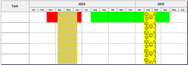 'skyblue and gold boxes 'black and yellow smiley faces .settasklinecurtain(1, 1, "red", "3/1/2024", "6/30/2024") .settasklinecurtain(1, 2, "green", "8/1/2024", "4/30/2025") .Refresh()
