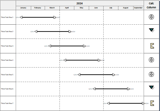 Example: Set up a values column and sets indicator properties. Sub Setcalculationcolumnproperties(ByVal objmilestones As Object) .setcolumnproperty(ncounter, "width", 0) .setcolumnproperty(ncounter, "SmartColumn", "none") Next .setcolumnproperty(10, "width", 1) 'Task Column For nCounter = 1 To 7 strtemp = "This is Task Row " + CStr(nCounter) .PutCell(nCounter, 10, strtemp) date1 = CStr(nCounter) + "/11/2024" .AddSymbol(nCounter, date1, 1, 1, 2) Next nCounter .PutCell(1, 11, "300") End With