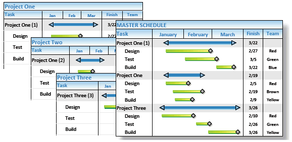 Merge two or more sub-schedules into a single master schedule to get a top-level view of multiple projects. Simply update the master schedule to see the latest sub schedule information.
