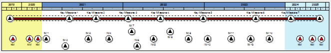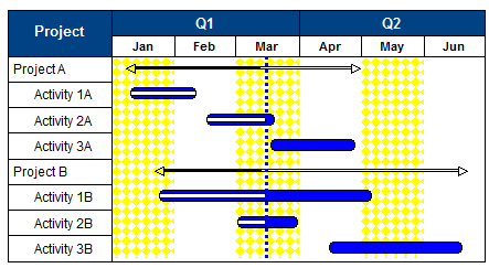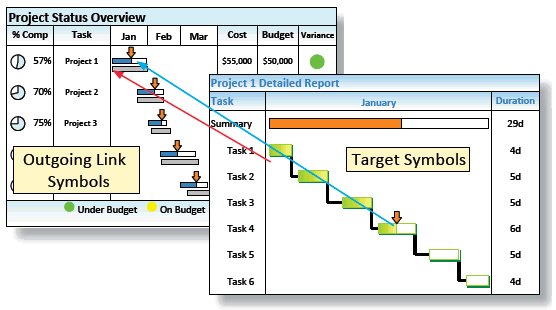Manage multiple projects through symbol linking. Base the date of a symbol on a different symbol in another schedule or the same schedule. In the example below, when a linked symbol in Project 1 Detailed Report moves, the corresponding symbol on Project Status Overview moves also.