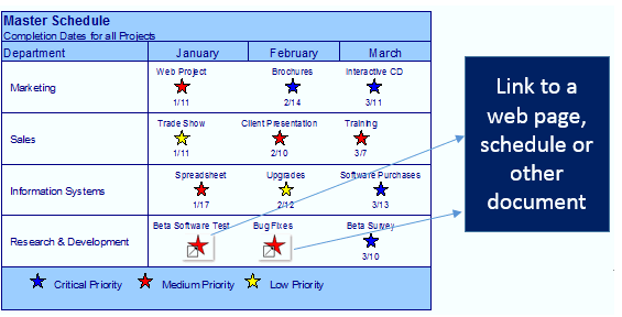 Any symbol or task row on the schedule can have hyperlinks to other schedules, documents or Internet web pages. Once linked, it's possible to open the objects with a click of the mouse. This makes it possible to use a Milestones Professional schedule to manage all aspects of a project!