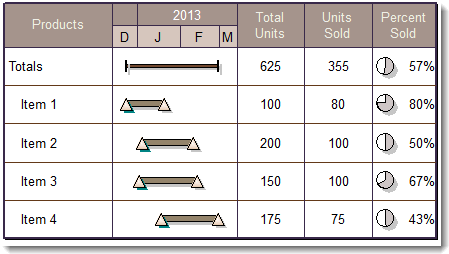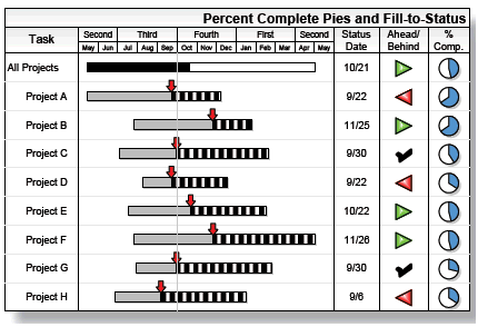 Percent Complete SmartColumns display the percentage with an optional percent complete pie, or just the percent complete pie symbol, as measured by the status symbol (here, the arrow symbol).