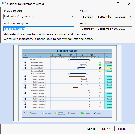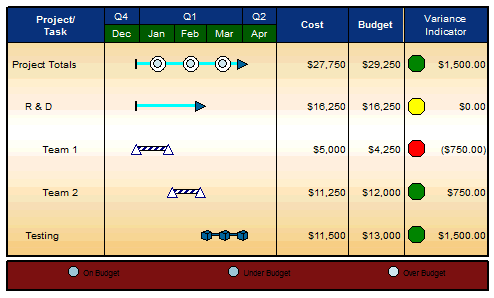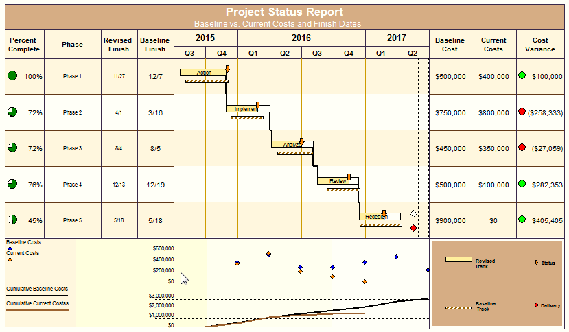 Milestones Professional allows you to track and graph numbers, make calculations between columns, and display status stoplights for at-a-glance reporting.