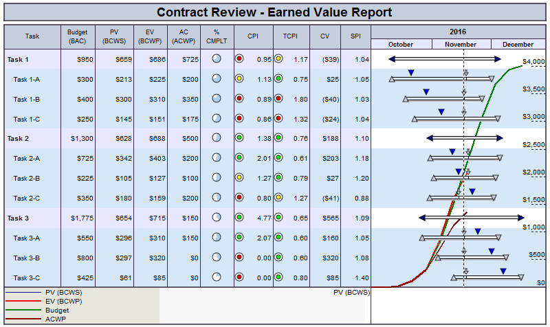 Produce reports showing Earned Value, Planned Value, Actual Costs, CPI, SPI, EAC, and EVMS fields using user-entered values, calculated values, imported values from MS Project, or a combination of these options.