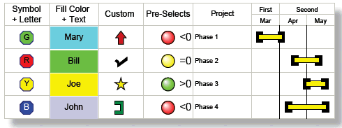 Display a wide variety of indicator symbols using a Stoplight SmartColumn. Stoplight SmartColumns offer a quick and easy method for adding stoplights, with no setup needed.