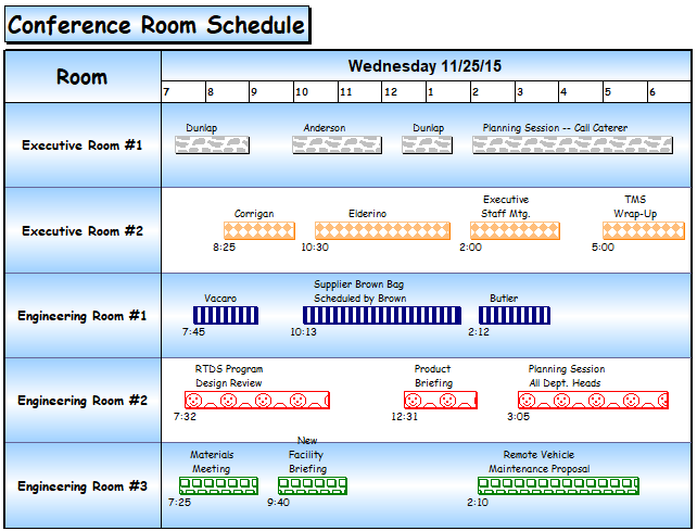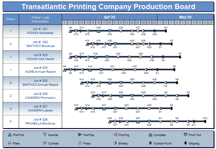 Schedules can show standard time scales ranging from minutes to years, and custom, user-defined periods. Choose minute, hourly, or daily for symbol placement; choose the top and/or bottom or within a task row for date heading placement; and use any frequency. Learn more.