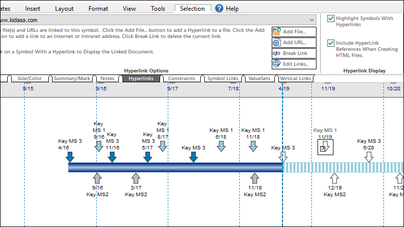 Answer:Yes, links (AKA hyperlinks) can be attached to a symbol, a task row, a freeform text block or a picture in Milestones. For example, to add one to a symbol, click the symbol and then click the Hyperlinks tab on the toolbar: Extensive help for this feature is available here.