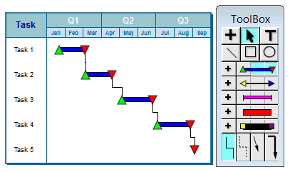 Answer:When a template is applied to a chart that contains task names, dates, symbols, connectors, etc., the new symbols in the template replace the old symbols in the chart according to their position in the Toolbox. For example, the chart's toolbox, in the first toolbox row, contains a green triangle for the start symbol, a blue bar and a red triangle for the end symbol. It also has a black line for the first vertical connector.