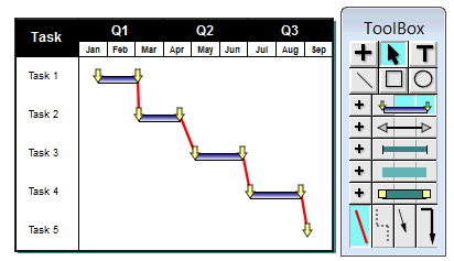The template's toolbox, in the first toolbox row has yellow arrows for the start and end symbols and a lower navy bar. It has a thick red line for the first vertical connector. Thus, when the template (below) is opened over the existing schedule (above), the green and red triangles become yellow arrows. The bar and vertical connectors also change to the new ones.