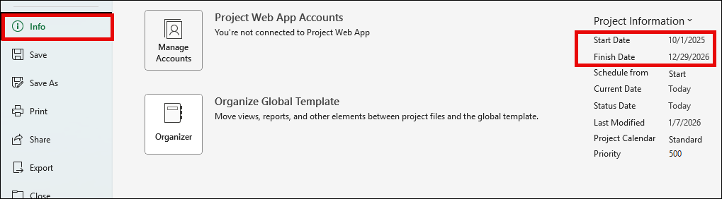 Probably what is happening is that the Microsoft Project file Start and End Dates are in 2001 instead of in the years of the current project. To check this: