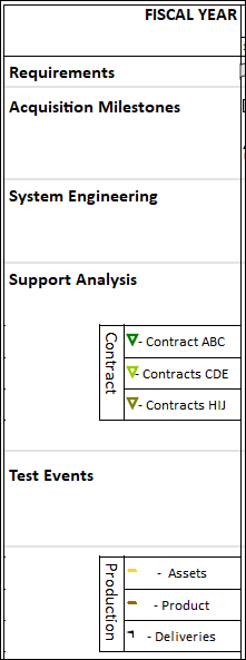 Turn off right grid for a cell:The first few rows (Requirements through Support Analysis) have the right grid turned off for columns 1 and 2. Select the cell (Click once on the row and then once again to select the cell.)