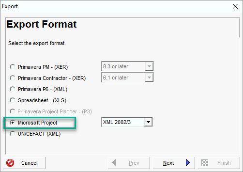 2. Pick Microsoft Project (default of XML 2002/3 is fine)
