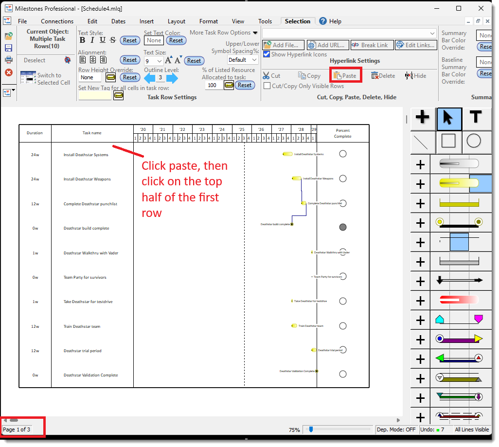 After cutting, click Paste and then click on the top half of the first row (of whatever page you want to replace): |