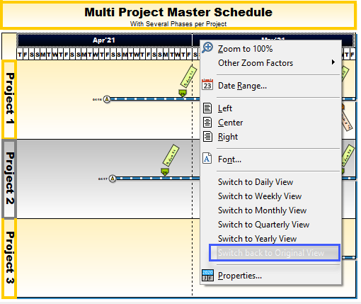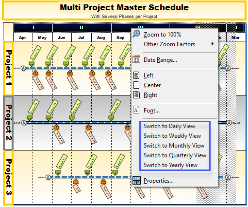 Answer:Milestones Professional provides "Switch-to" view options for fast date switching. Simply right-click in the Date Heading area at any time and select from a list of different date views.