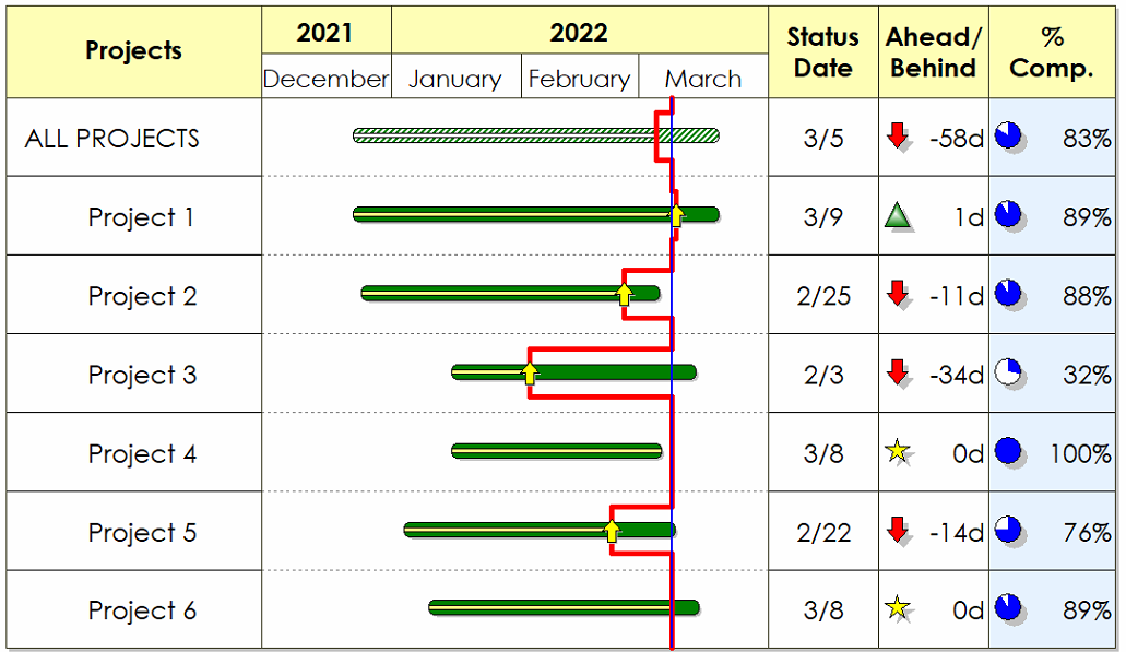 After the template is applied:Bars and symbols have been changed. The Ahead/Behind column is hidden and a new color theme has been applied.
