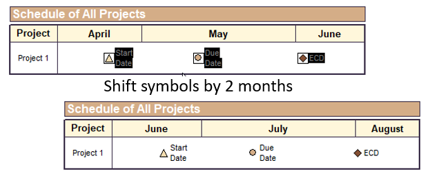 How can I move a group of symbols about 2 months to the right all at the same time?