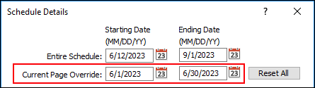 Change the date range for a single page on the schedule After inserting the second page, how do you change the date headings on it without changing the first page?