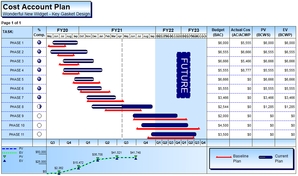 Cost Variance (CV) - CV = Earned Value - Actual Cost. Calculates the dollar value of what was accomplished to date against what has actually been spent.