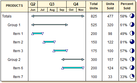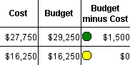 A Calculation/Indicator SmartColumn can display calculation results; symbols, text or colors based on those results; symbols, text, or colors based on another column's values; or a combination of these choices, as well as convert calculation results to percentages with matching percent complete pies. See:Tutorial Lesson 13 - Calculation/Indicator and % Complete Columns Below are short descriptions and examples of how Calculation/Indicator SmartColumns can be used. Click a link for detailed instructions. The Calculation/Indicator SmartColumn makes it possible to: