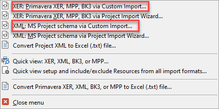 Choose File | Import Options | Custom | Custom Import (or, choose File | Import Options | XER XML MPP BK3 and choose one of the formats.)
