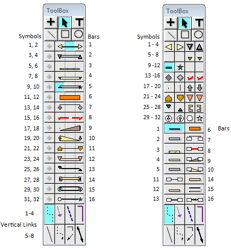 The symbol and bar types used are taken from the toolbox in the order of field usage as shown in the following table. See the picture below for symbol and bar numbering.