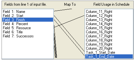 Under Fields from line 1 of input file, click once on a field to import; under Field Usage in Schedule, click on a Milestones column or field where that data should appear. A mapping line will be appear to show the relationship.