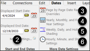 Choose (the toolbox Arrow tool.). Click once on the date headings within the schedule area. This will display the Selection menu. The Date Headings section has all the options for the date headings.