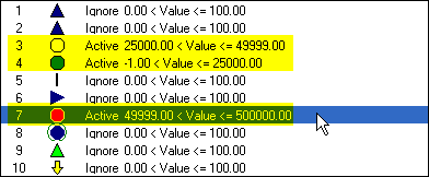 The green stoplight symbol will appear in a cell whose value is greater than -1 and less than or equal to 25,000. The yellow stoplight symbol will appear for values greater than 25,000 and less than or equal to 49,999. The red stoplight symbol will appear for values greater than 50,000 and less than or equal to 500,000.