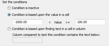 Condition is based upon the value in a cell and enter numbers to establish a value range.