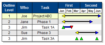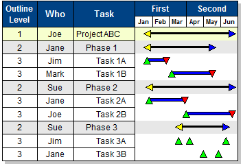 In this example, a Who column contains the name of the person responsible for each Project, Phase and Task.