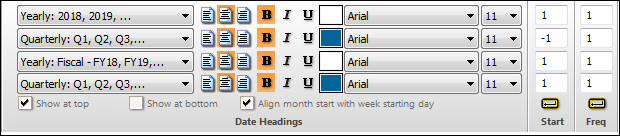 The date heading type Quarters aligns itself with fiscal years (i.e. Q1 aligns with the beginning of the fiscal year). With the start number feature, quarters can be offset to align with the calendar year. For example, if Q2 happens to align with the beginning of the calendar year, then an offset number of -1 can be entered to force Q1 to align with the beginning of the calendar year. Thus, it's possible to have "calendar year quarters" and "fiscal year quarters" in the same date heading. As shown below, quarters are aligned with the calendar years in the top two date heading rows, and aligned with the fiscal years in the bottom two rows.