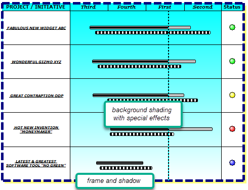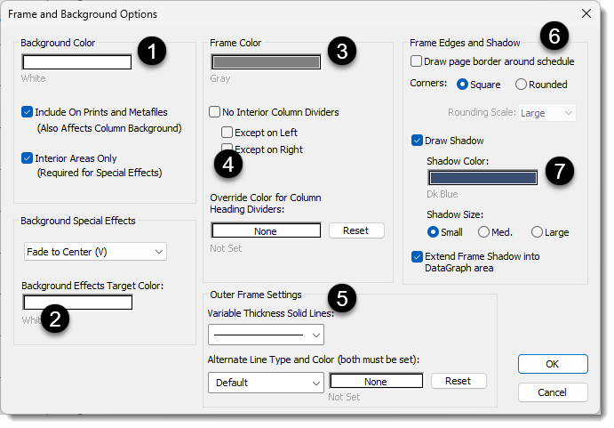The schedule's frame is the border of the schedule and all interior line separators, excluding the horizontal and vertical gridlines. The interior and exterior of the schedule can have background colors and special fade effects. The border is drawn around the outside of the schedule, as opposed to the schedule frame.