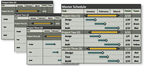 A Milestones Professional master schedule is a compilation of separate Milestones Professional schedules (sub-schedules). Usually, the sub-schedules are each maintained by different people or departments, each responsible for one or more projects. Thus, the master schedule gives a view of all projects. See: Tutorial Lesson 10 - Master Schedules Changes to data in the sub-schedules appear in the master schedule. Any changes to the master schedule will not appear in the sub-schedules. Contents Example: Master schedulesIn this example, schedules for Project One, Project Two, and Project Three are each maintained by different managers. The manager overseeing the progress of all three projects sets up a master schedule which merges the three files into a single file. When he needs to see the latest status on all three projects, he simply updates the master schedule with the latest data from Projects One Two and Three Three Milestones schedules......merged into a single Milestones master schedule.