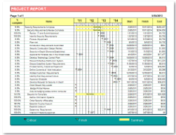 This is a common defense industry format which can be easily customized to meet reporting requirements. Column on the left: 1) Name, Finish, Baseline Finish, Finish Variance Columns on the right: BCWS, BCWP from Microsoft Project Graph: Timescaled PV and EV (BCWS and BCWP) from Microsoft Project
