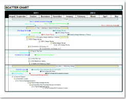 The purpose of this format is to display as many tasks as possible on as few rows as possible without collision. Schedules with many dates very close together may collide, still. Increasing the width of the schedule may help spread-out the symbols. This format uses the Microsoft Project Name field and imports that information into a column on the left side of the Milestones schedule area. The import will bring into the schedule area Start date, Finish Date and Milestones.