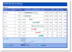 This format uses the Microsoft Project Task ID, Name, Duration, Start, Finish, Percent Complete Cost and Work fields importing that information into columns on the left and right sides of the Milestones schedule area. The import will brings into the schedule area under the each of the resources their tasks showing a start symbol on the first day of the task connecting with a horizontal bar to an end symbol depicting the last day of the task. In the schedule area Milestones Professional draws a summary bar reflecting all the resource's tasks. The import uses the Cost and Work columns to set-up Type 3 ValueSets: Allocate Column Values Across Timeline. A bar DataGraph is added at the bottom of the schedule showing Cost and Work. See Making Changes to DataGraphs. x Can not be refreshed. x Cannot be customized and used for a custom template |