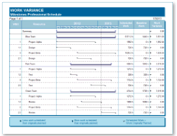 This format uses the Microsoft Project WBS, Resources, Scheduled Work, Baseline Work, and Work Variance fields importing that information into columns on the left and right sides of the Milestones schedule area. Milestones converts the Microsoft Project Work Variance information into indicator symbols.