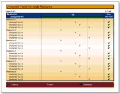 The Unstarted Tasks report displays all tasks which do not have an actual start date. A chart is produced showing the WBS # and Task name in the left columns. To the right of the schedule, indicators will show whether a task is critical and also whether or not the task is late. |