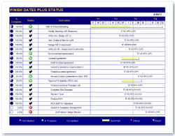 This format uses the Microsoft Project Name, Finish VarianceFinish Variance, Baseline Finish and finish fields and imports that information into columns. Name, and Finish VarianceFinish Variance import into columns on the left side and Baseline Finish and Finish imports into columns on the right side of the Milestones schedule. Milestones converts the Microsoft Project Finish Variance information into indicator symbols. All finish variances greater than zero is considered Ahead of Schedule and depicted by a green circle. All finish variances less than zero is considered Behind Schedule and depicted by a red circle. All finish variances equal to zero is considered On Schedule and depicted by a yellow circle.