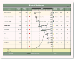 In the schedule: baseline and normal start/finish bars. Also, on the schedule, a graph representing Budget, Actual Cost and Earned Value (BCWP)." In the columns: - name, baseline and actual cost, Cost Performance Index (CPI), percent complete, earned value, cost variance (CV). An indicator for CPI displays Red for CPI less than 1, Green for CPI 1.3 or higher and Yellow for CPI between 1 and 1.3" From Microsoft Project Milestones brings in the numeric percent complete then adds a percent complete pie symbol. Note: Earned Value comes directly from Microsoft Project. However, instead of the timescaled values, the values are distributed across each task using Microsoft Project values for each task.