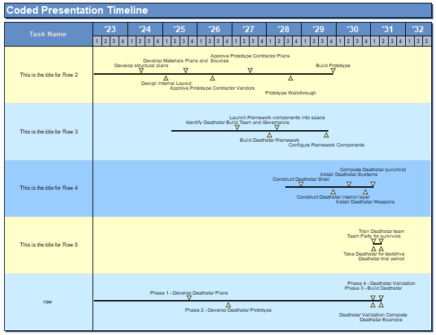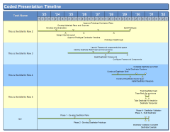 Coded Presentation Timeline and Coded birds on a wire display finish dates grouped by a code. For both, Milestones Professional will draw a bar from the earliest date to the latest date. For Coded Presentation Timeline, finish dates are represented both above and below the bar, alternating from the earliest date to the latest date. For Bird on the wire, finish dates are represented by triangles above the bar only. Step 1: Code the Microsoft Project schedule Step 2: Produce the coded schedule This format displays the finish dates grouped by code. Milestones Professional will also show the earliest start date of all the tasks in the group and the latest end date of all the task in the group as a symbol, connector, symbol. Each grouped task can have the task rows colored the same color. A task column will be imported into the schedule and the information in the task column comes from the code field Use this title. This format can be refreshed. |