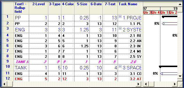 Here's an example of how a Microsoft Project schedule might be coded. (The numeric fields are Microsoft Project Number fields. The Code field (AKA Rollup field) is a Text Field (Text 1 in the example below):