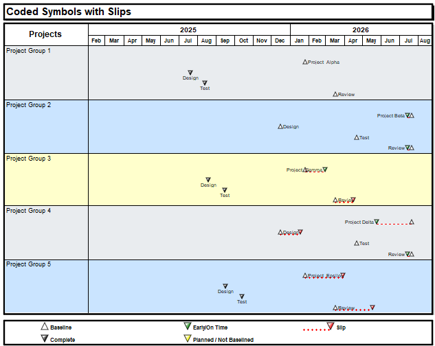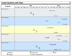 Several coded formats are available in Milestones Professional. Five of these formats (Dynamic Rollup, Coded Gantt, Coded Finish Dates, Coded Presentation Timeline and Coded Symbols with slips) use the same coding mechanism. Coded Symbols With Slips