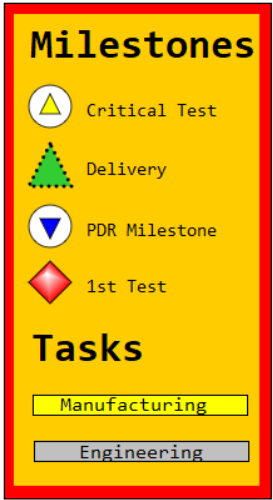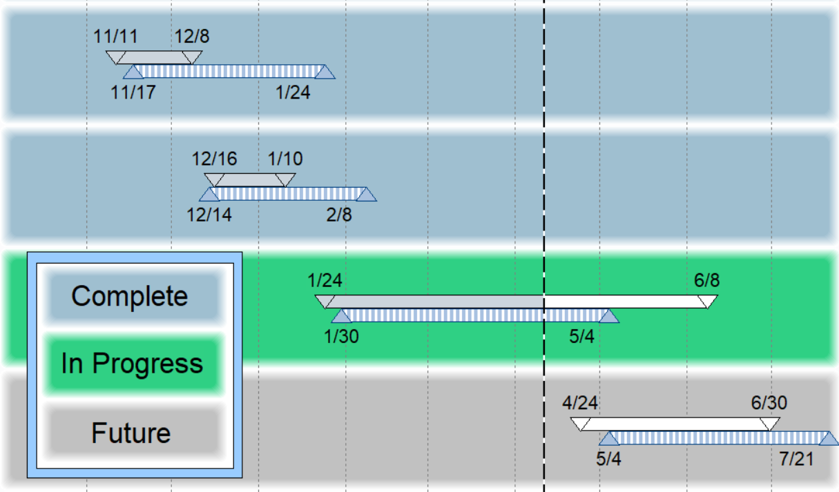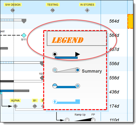 For example, the legend shown on the left was created using background boxes for structure, large labels made with Freeform Text, six individual boxes with attached Legend Entries, and additional Freeform Text to label the bars. This flexible approach allows you to design legends that are both clear and tailored to your specific schedule layout.